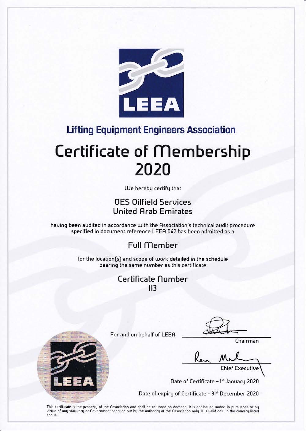 We are pleased to announce that OES Asset Integrity Management have been awarded full member status of The Lifting Equipment and Engineers Association (LEEA).